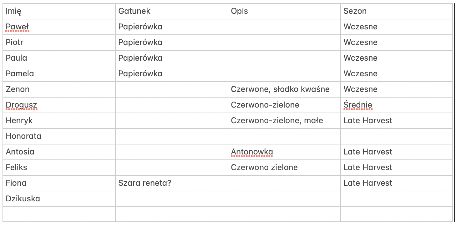 Ponieważ, z jednej strony, nie znamy nazw wszystkich gatunków naszych drzew, a z drugiej strony, nawet drzewa tego samego gatunku różnią się czasem owocami, postanowiliśmy nadać naszym jabłoniom imiona.